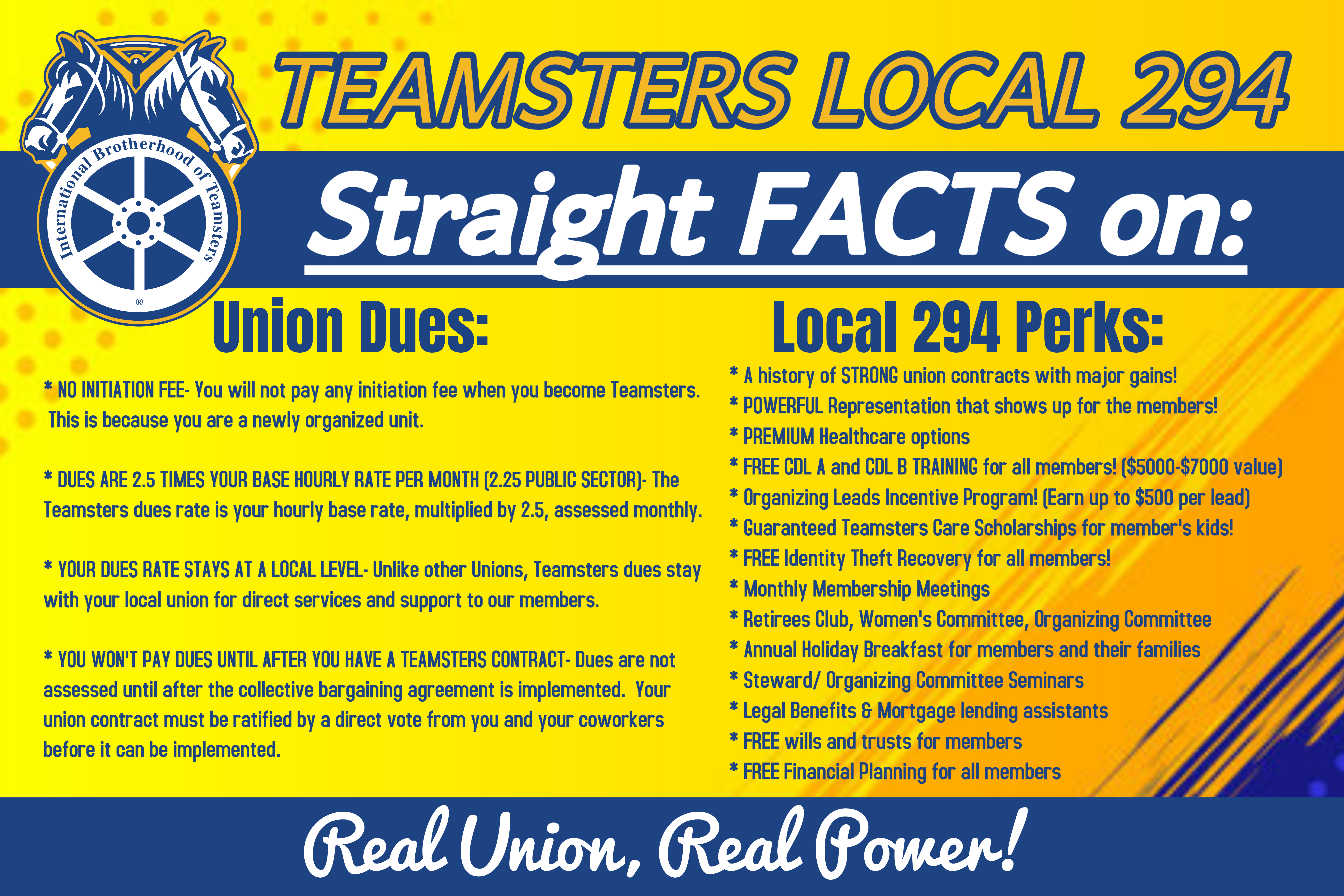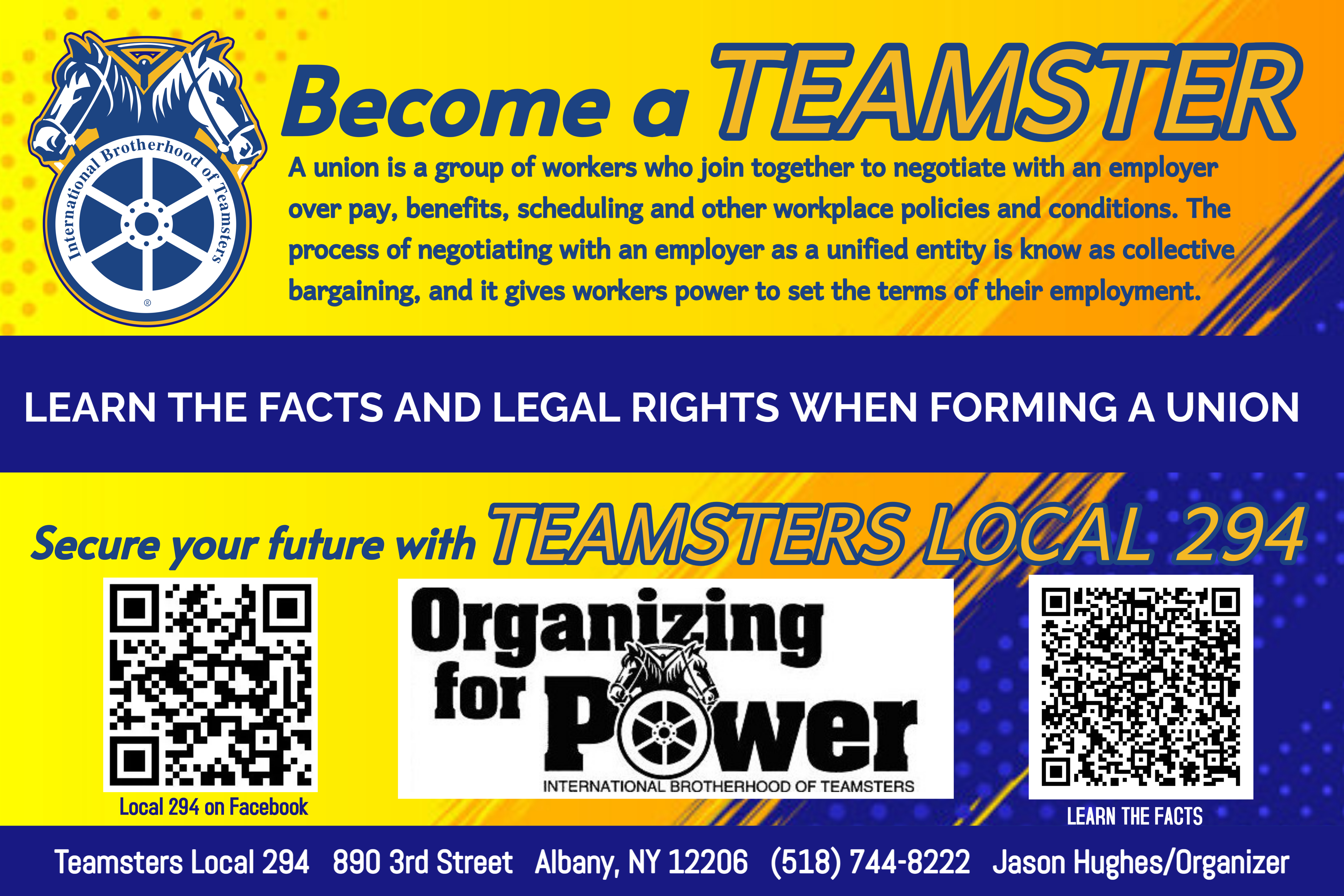 Most employers wish their company could remain union free because unions stand up for the rights of employees and demand that their voice be heard. The only way to force a positive change in your workplace is for you and your co-workers to have representation from Teamsters Union Local 294. One employee all alone will be ignored, but when you and your co-workers organize with Teamsters Union Local 294 and become united, we will be able to negotiate a legally binding contract that includes better wages, affordable health care, a secure retirement and a safer workplace for all. Members of Teamsters Union Local 294 understand that the only way to ensure job security and protect the future of their families is to negotiate a legally binding union contract. When you and your co-workers negotiate a union contract, your wages and benefits will be part of the negotiating process. When was the last time that your boss asked you for your input when it came to your review? The rights and benefits in a legally binding contract cannot be reversed once they are agreed upon. The Teamsters will fight to get you and your family the compensation you deserve. The rights outlined in the contract cannot be altered without your approval. Therefore, as an example, if the contract states that you are entitled to two full weeks of vacation a year, you are able to take those vacation days off without negotiating on an individual basis with management. The members of the Teamsters Union understand that the only way to ensure job security and protect the future of their families is to negotiate a legally binding union contract. For further information on organizing, please feel free to send an e-mail to our Organizer Jason Hughes jhughes@teamsterslocal294.org or call (518) 744-8222. All calls and emails are confidential. CLICK HERE for your Right to Form a Union!CLICK HERE for your Rights during Union Organizing! CLICK HERE to get a confidential call to talk to our Organizer!